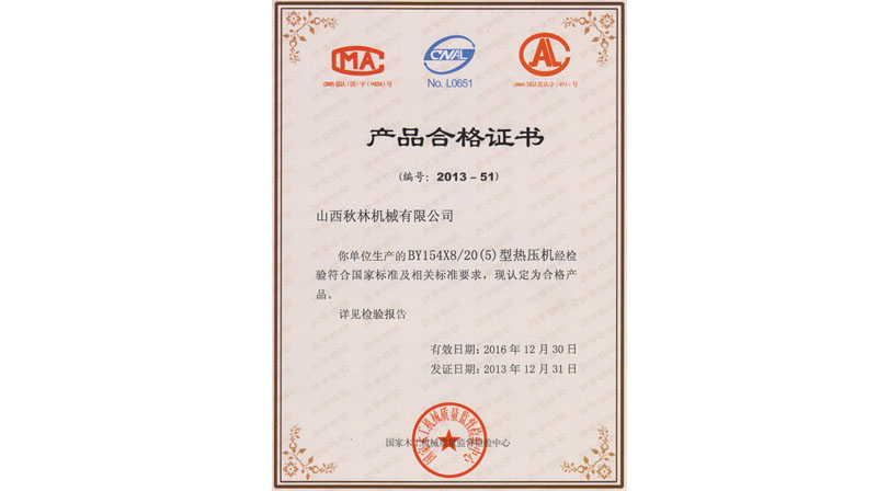 BY21型熱壓機、BY624×8/16、BY154×8/20(5)通過國家木工機械質(zhì)量監(jiān)督檢驗中心檢驗