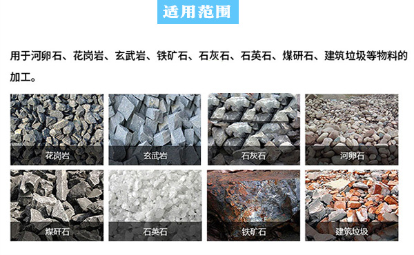 【適用物料】:青石、河卵石、石灰石、方解石、石英石、鐵礦石、花崗巖、輝綠巖、玄武巖、輝綠巖、水泥熟料等