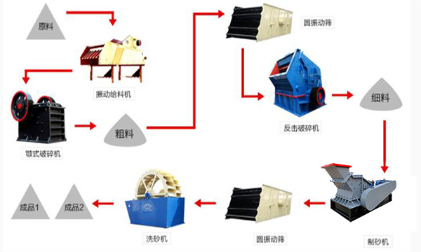 一步河卵石原材料進(jìn)入振動(dòng)給料機(jī),通過(guò)提升機(jī)將河卵石物料輸送到顎式破碎機(jī)進(jìn)行破碎;二步,產(chǎn)成的粗料由膠帶輸送機(jī)輸送至細(xì)碎機(jī)進(jìn)行進(jìn)一步破碎;三步,細(xì)碎后的河卵石進(jìn)振動(dòng)篩篩分出兩種不同粒度的石子,滿足制砂機(jī)進(jìn)料粒度的石子進(jìn)制砂機(jī)制砂,另一部分料返回再進(jìn)細(xì)破;通過(guò)制砂機(jī)將其制成砂,經(jīng)洗砂機(jī)清洗后制成成品砂,終產(chǎn)出符合要求的產(chǎn)品粒型。